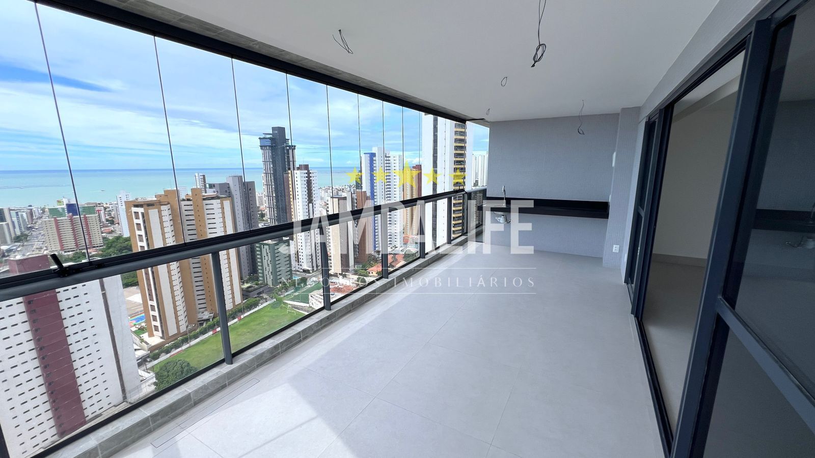 O apartamento com vista definitiva para o mar, de posição sul, medindo 206 m², possui varanda gourmet ampla, sala para 03 ambientes, 04 suítes, lavabo, dce, cozinha, área de serviço e 03 vagas de garagem.