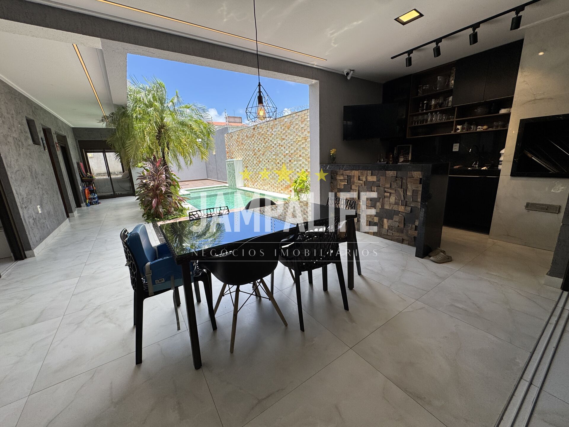 A cozinha conversa diretamente com a área gourmet e a piscina, criando um ambiente perfeito para receber amigos e família. Todos os quartos são voltados para a área da piscina, o que garante excelente ventilação e iluminação natural, tornando a casa ainda mais agradável.