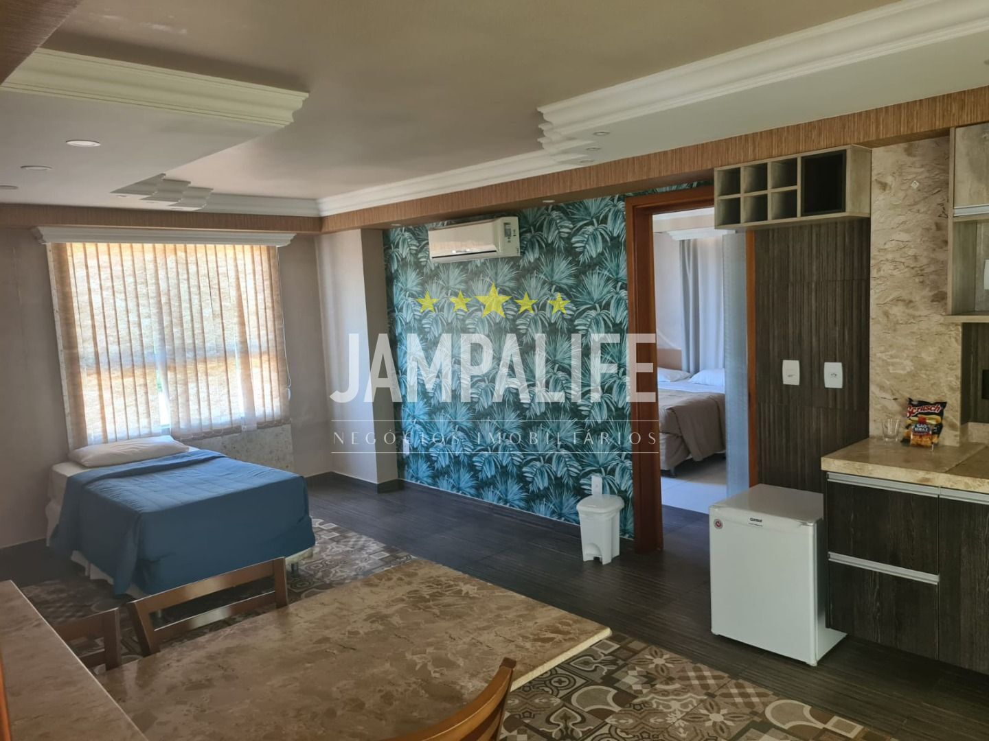 O Flat possui vista lateral definitiva para o mar da varanda, 01 quarto com ar condicionado split, cama box de casal reversível para 2 camas de solteiro, cabeceira, guarda-roupas, bancada de apoio, TV de Led, 01 sala com 01 cama de solteiro e 01 cozinha com frigobar, mesa de mármore com 03 cadeiras, balcão com pia de mármore, 01 banheiro com cuba com torneira suspensa, com box em blindex, ducha higiênica, espelho, suportes para toalhas e 01 vaga de garagem.